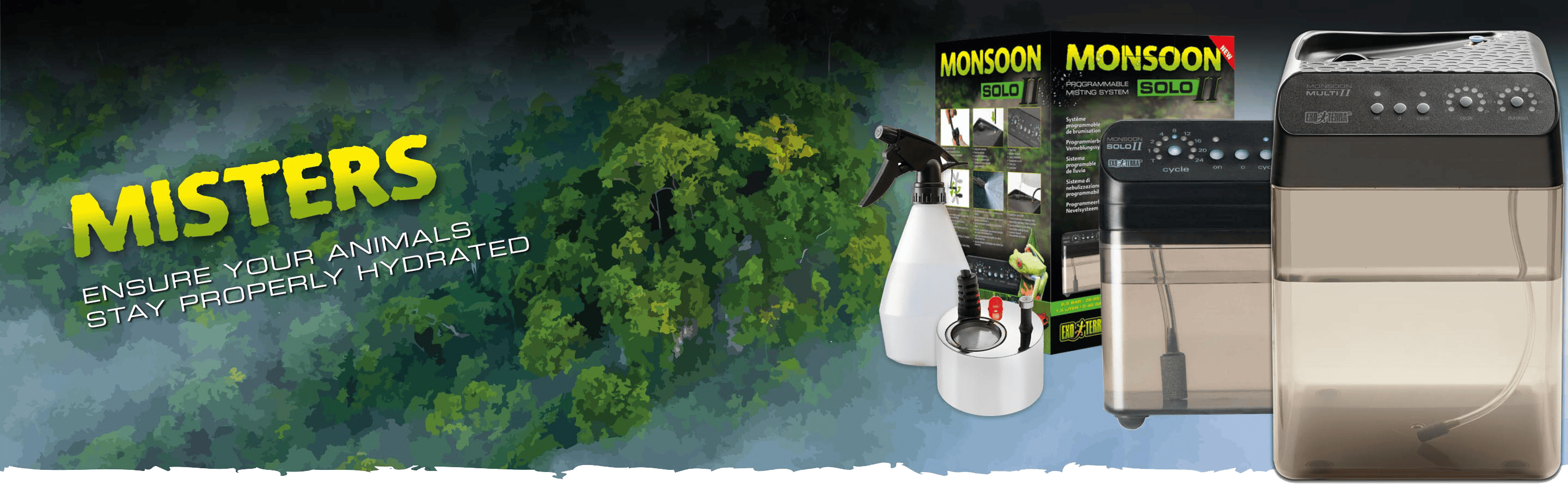 Exo Terra Monsoon Multi II - это программируемая система подачи осадков, подходящая для всех типов террариумов. Она помогает поддерживать оптимальную влажность, генерируя мелкий туман с запрограммированными интервалами, продолжительность и частоту которого можно легко регулировать в зависимости от типа животного или растения. Частое опрыскивание помогает стимулировать размножение и является необходимостью при размещении живых тропических растений, таких как бромелии, орхидеи, мхи и т. д.